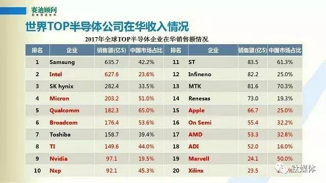 赛迪研究院数据统计,在2017 年世界前20 半导体企业中,美国企业占了13 家,在中国市场销售额合计是667 亿美元。其中,高通、博通、美光有一半以上的市场销售额是在中国实现的。