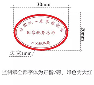 新启用的发票监制章形状为椭圆型,长轴为3厘米,短轴为2厘米,边宽为0.1厘米,内环加刻一细线,上环刻制“全国统一发票监制章”字样,中间刻制“国家税务总局”字样,下环刻制“××省(区、市)税务局”字样,下环字样例如:“江苏省税务局”、“上海市税务局”、“内蒙古自治区税务局”、“新疆维吾尔自治区税务局”。字体为楷体7磅,印色为大红色。