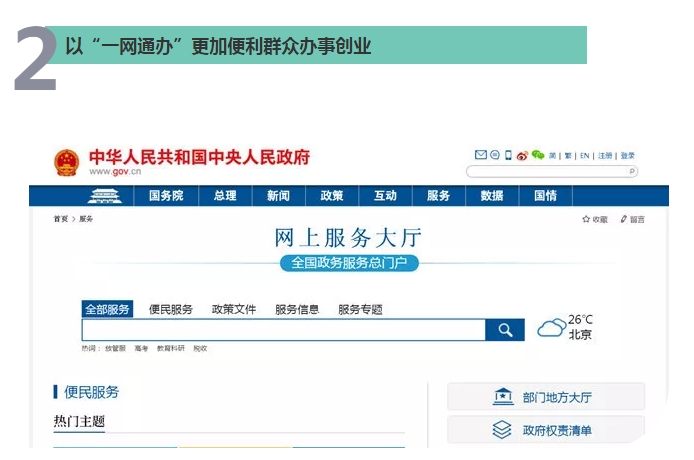 7月18日的国务院常务会议还确定了加快建设全国一体化在线政务服务平台的措施,以“一网通办”更加便利群众办事创业。会议要求各级政务服务平台要从政府供给导向向群众需求导向转变,注重回应和解决社会热点难点问题;加快打破“信息孤岛”,实现数据“一网共享”;建设身份认证、电子印章、电子证照等统一系统,以中国政府网为总门户,与各地区各部门政务服务平台联通,面向市场主体和群众的政务事项一律公开,为社会提供政务服务公共入口,逐步做到线上线下一套服务标准、一个办理平台;畅通网上咨询投诉渠道等。